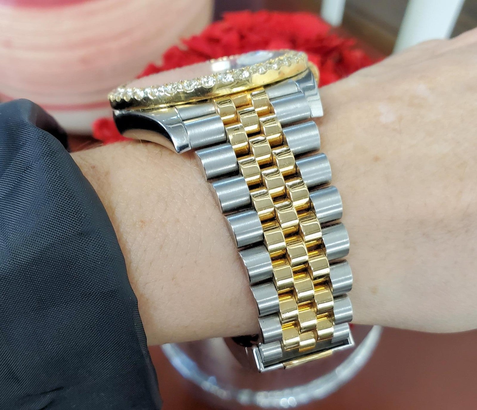 This 41mm Rolex Datejust, reference 126333, is a stunning two-tone timepiece that combines classic Rolex craftsmanship with luxurious custom enhancements. Crafted from a blend of 18k yellow gold and stainless steel, it features a white dial with luminous markers, adding depth and brilliance to an already elegant design. The date window sits at 3 o’clock, magnified by Rolex’s cyclops lens beneath a scratch-resistant sapphire crystal.