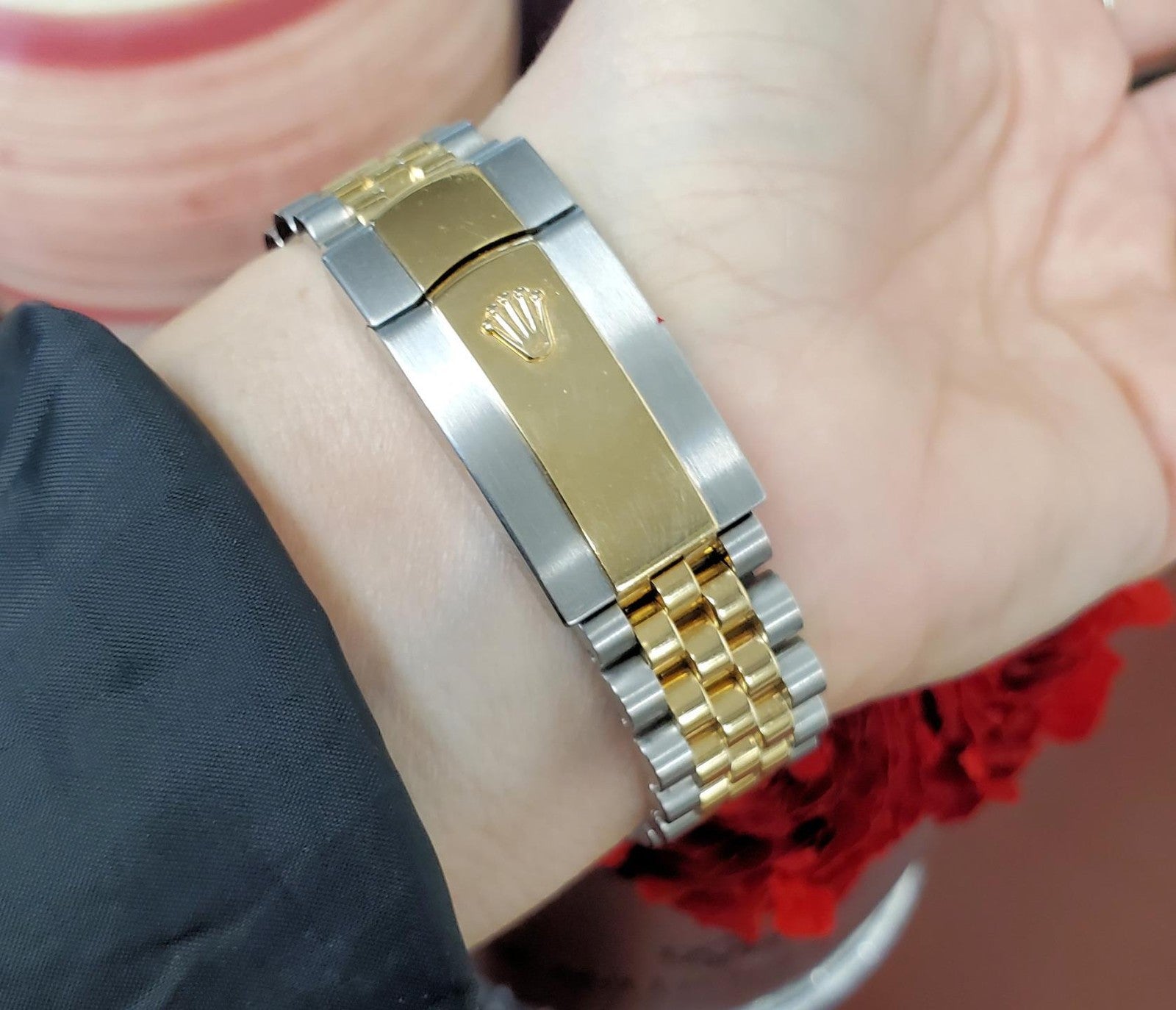 It’s paired with a two-tone Jubilee bracelet in 18k yellow gold and stainless steel, known for its comfort and distinctive five-piece link design. The bracelet is in excellent condition and shows hardly any signs of wear.