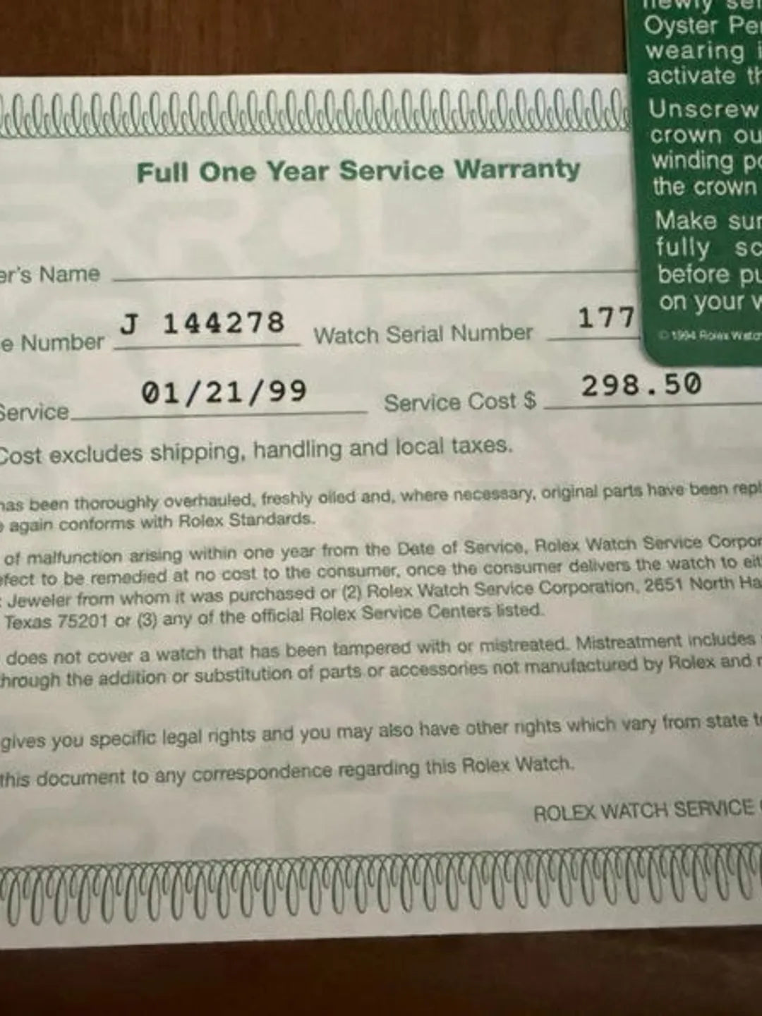 Original Rolex service warranty paper