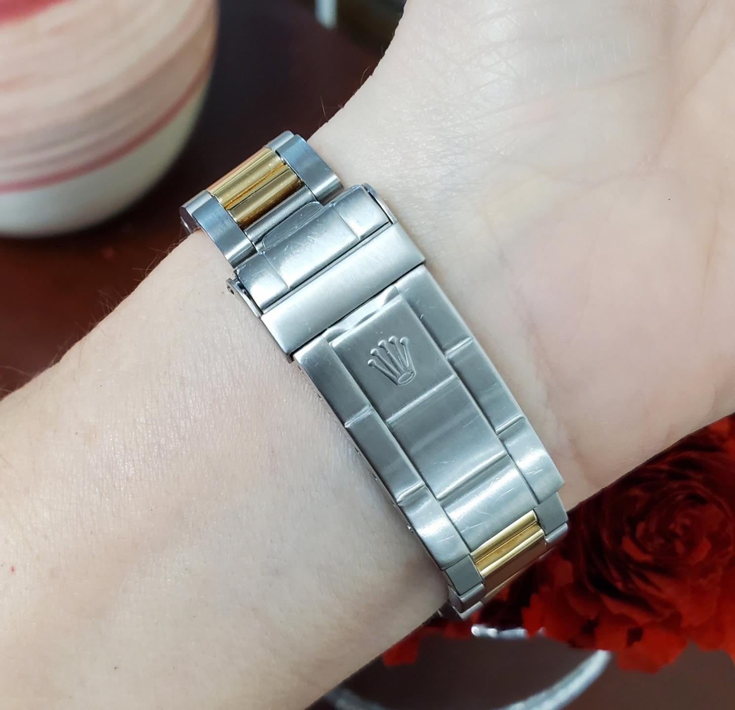The two tone Oyster bracelet measures approximately 7 1/4 inches as currently sized and can be resized to fit your wrist comfortably. The bracelet shows light, normal stretch for its age but remains solid and secure on the wrist.
